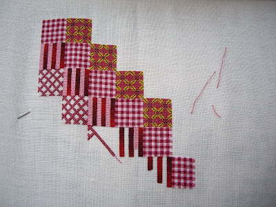 The hardest part of this cushion is deciding what pattern goes next and what shade of red I should use. Once I have decided on the pattern I then have to go through my stock of silks. I am trying to use the same shades in more than one block to help tie it all together. I have to do 10 blocks across and down. I will have them diagonal across the cushion. I have finished 14 blocks, with 86 to go. Am I mad or what?