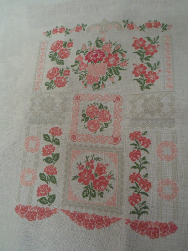 It looks so pretty, charming and very old fashioned, perfect for the retro look going around now, I have no idea what to do with it, I don't have a room it would fit into. But it was such a joy to stitch!The top panels I was not going to change, but the leaves called out to be green, such cute flowers.